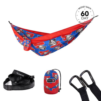 NRL Newcastle Knights x Nakie Double HammockDimensions: 3m × 1.8mWeight rating: 225kgWeight: 600g 2 × Hammock StrapsLength: 2.3m per strapWeight...