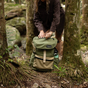 Man hiking in forest with sustainable Nakie backpack made from recycled plastic bottles, ideal eco-friendly hiking gear Nakie - Australia
